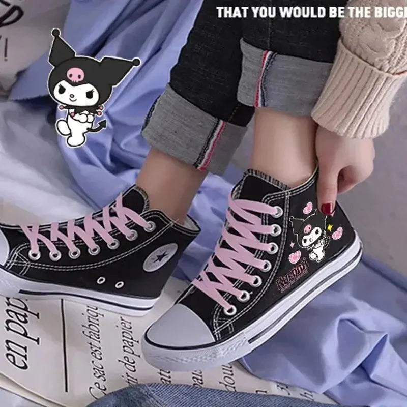 These New Kuromi Print Black Canvas Shoes feature a totem design that adds a touch of whimsy. Made with canvas upper and lining material, the shoes have a flat heel height of no more than 1cm for comfortable wear. Finished with a lace-up closure, they are perfect for adults during the spring and autumn seasons. The insole, made of fabric, ensures a proper fit, while staying true to size.