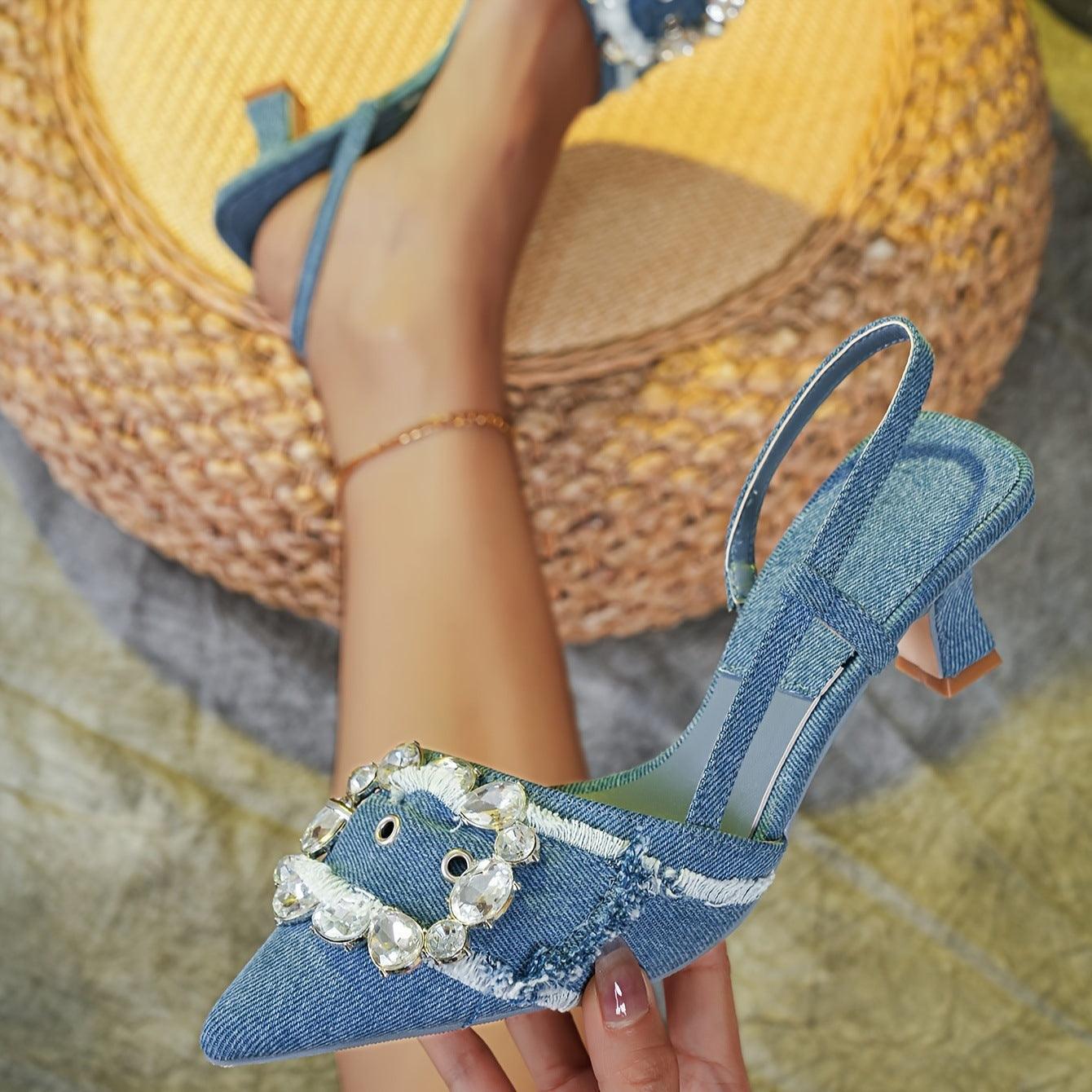 Elevate your style and comfort game with these versatile sandals. Perfect for all seasons, you can rock them on vacation or any day. Featuring rhinestones and denim, you'll be ready to impress no matter where you go.