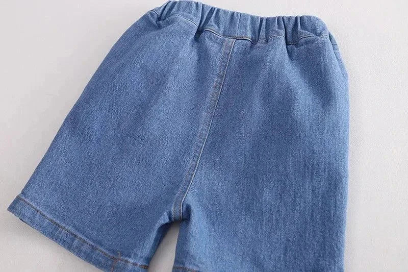 This product is a Summer Baby Boys Spiderman Short Sleeve T-shirt+Jeans Set, available in four age ranges (13-24m, 25-36m, 4-6y, and 7-12y) and designed for both boys and girls. It features a casual style with a cotton and acetate material composition and cartoon pattern. The set includes a regular short sleeve t-shirt with an O-neck collar and a pair of shorts with a pullover closure. The fit is true to size for children ages 1-7 years. Outerwear is included in the set.