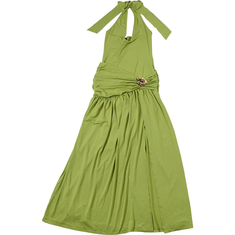 This striking summer dress combines contemporary design elements with flattering silhouettes. Crafted from polyester, it features a halter neckline and sleeveless cut that showcase the shoulders and back. The slim-fitting bodycon construction is enhanced by asymmetric detailing, strategic ruching, and a maxi length with a thigh-high split for movement and allure. Three-dimensional embellishments and tie accents add visual interest, while the solid fabric ensures versatility. Ideal for evening events and club settings, this piece delivers sophisticated sex appeal with modern construction techniques that ensure both comfort and confidence.